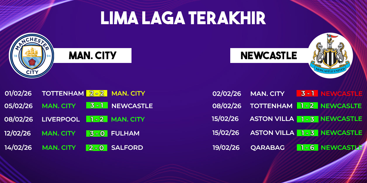 Dalam lima pertemuan terakhir di semua kompetisi, Manchester City cenderung lebih dominan dibanding Newcastle. Statistik ini mencerminkan konsistensi permainan City yang sulit ditandingi dalam jangka panjang.